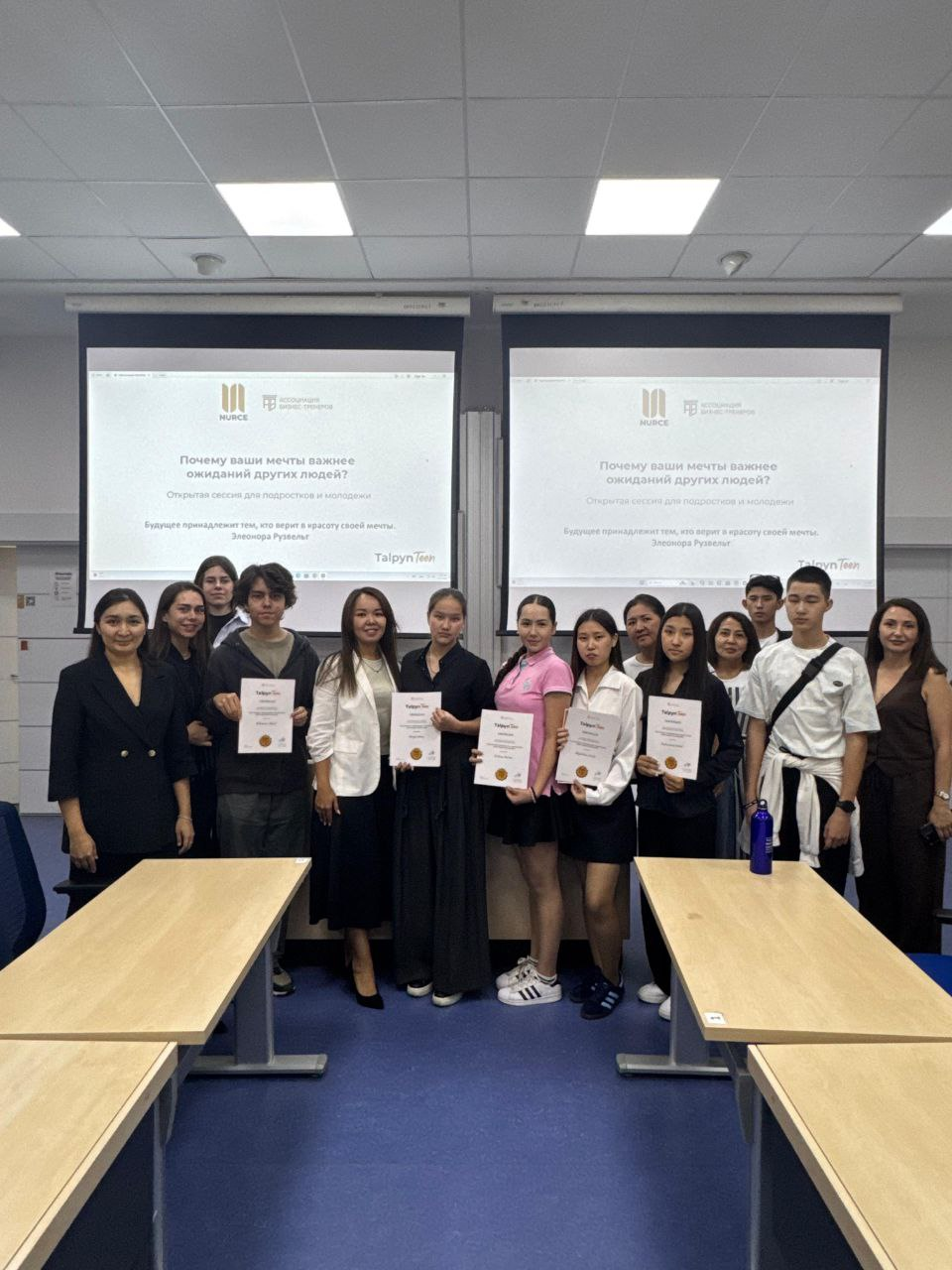 После церемонии вручения сертификатов в партнерстве с Центром Исследования Предпринимательства Назарбаев Университета прошла открытая сессия по бизнес-мышлению для старшеклассников и студентов. В мероприятии приняли участие более 60 человек — подростки, студенты и их родители. В рамках программы профориентолог Зарина Абылхахова провела мастер-класс «Я и мой путь. Осознанный выбор будущего», где участники смогли глубже разобраться в своих интересах, ценностях и возможных профессиональных направлениях. Ментор и коуч Айгерим Тарбагатаева в своём выступлении подчеркнула важность умения слышать себя и ставить собственные мечты выше чужих ожиданий, особенно в период выбора жизненного пути. Особым гостем встречи стала Гульдана Есетова, которая поделилась личной историей ранней профориентации своей дочери и рассказала о реализации её социального проекта в Кремниевой долине, наглядно показав, как поддержка семьи и осознанный подход помогают раскрывать потенциал подростков.